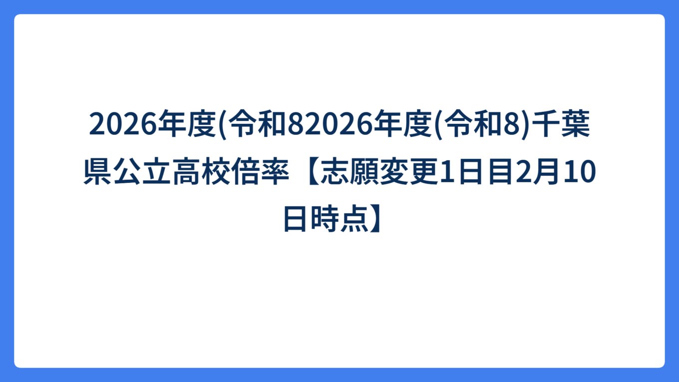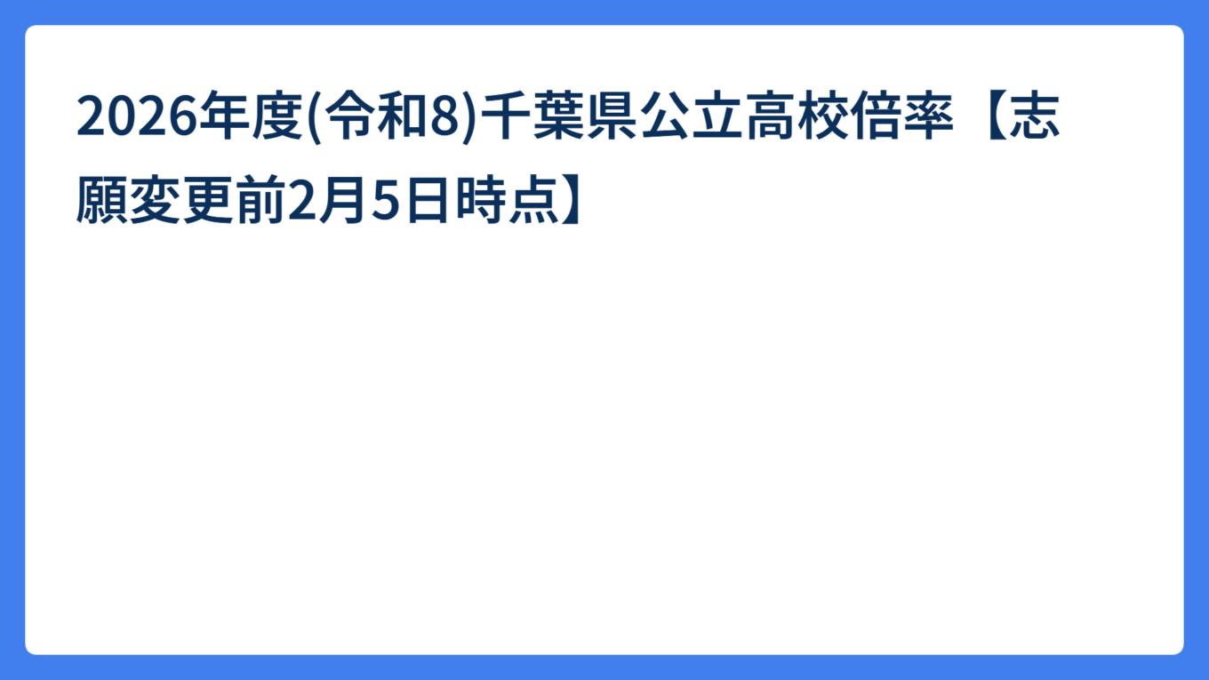 2026年度 千葉県公立高校入試情報Information 入試日程 新着記事News 2026年度(令和8)千葉県公立高校倍率【確定志願者数2月13日】 2026.02.13 定員・倍率 2026年度(令和82026年度(令和8)千葉県公立高校倍率【志願変更1日目2月10日時点】 2026.02.10 定員・倍率 2026年度(令和8)千葉県公立高校倍率【志願変更前2月5日時点】 2026.02.05 定員・倍率 入試日程 定員・倍率 人気記事Popular Post 2026年度(令和8)千葉県公立高校倍率【志願変更前2月5日時点】 1469 views 2025年度(令和7)千葉県公立高校倍率【確定志願者数2月14日】 1117 views 2026年度(令和8)千葉県公立高校倍率【確定志願者数2月13日】 941 views 2026(令和8)年度 公立高校入試日程 233 views 2026年度(令和82026年度(令和8)千葉県公立高校倍率【志願変更1日目2月10日時点】 181 views 2025年度(令和7)千葉県公立高校倍率【志願変更1日目2月12日時点】 131 views 2025(令和7)年度 公立高校入試日程 78 views 2025年度(令和7)千葉県公立高校倍率【志願変更前2月6日時点】 49 views